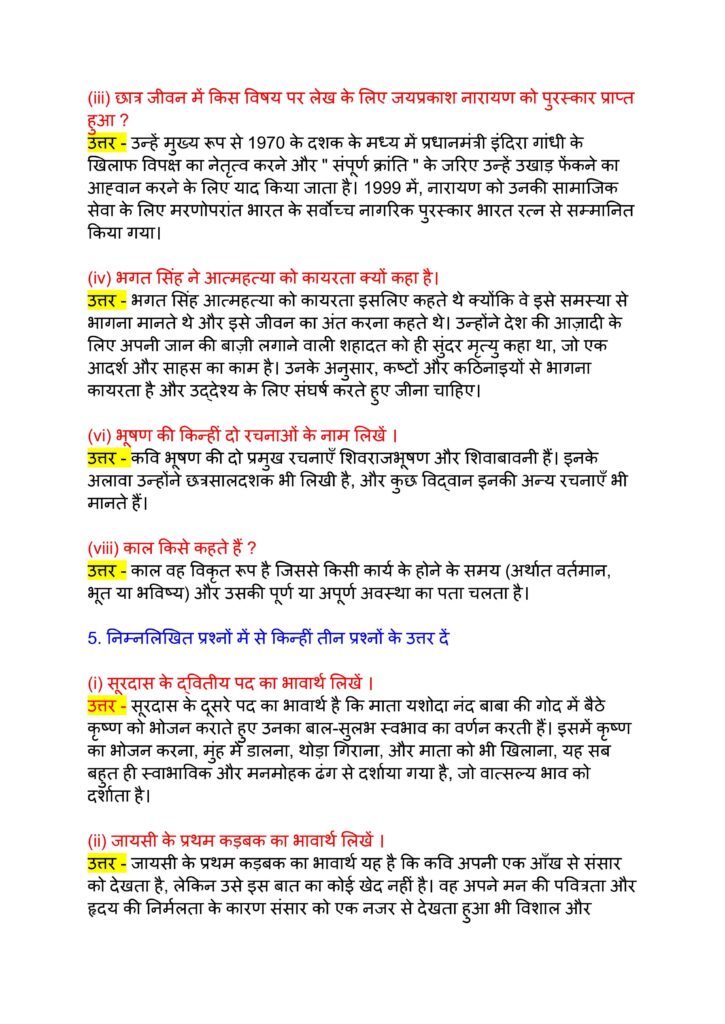 Bihar Board Class 12th Hindi September Half Yearly Exam Subjective Answer Key Download Active Link 2025