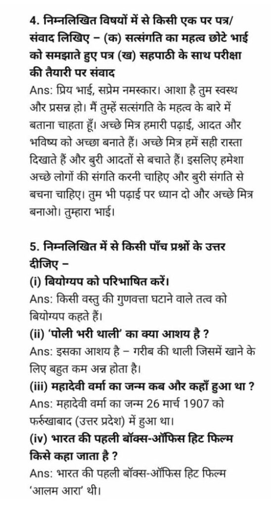 Bihar Board Class 9th Hindi September Half Yearly Exam Subjective Answer Key Download Active Link 2025